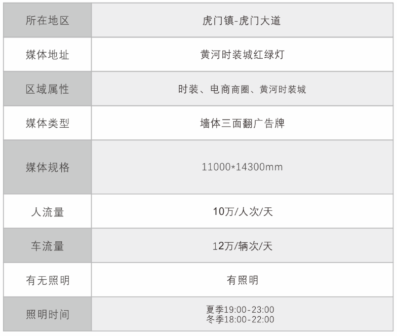 资源简介 本广告位为三面翻广告牌,位于虎门大道与银龙路十字路口,该路段为虎门商业中心区及城市主干道交汇处,是进入虎门镇中心的必经之路;广告位周边有黄河时装城、美斯威尔顿酒店、富民时装城等虎门地标商业体,下方为人行天桥,人车日流量均达到10万以上,设有多盏高功率射灯,晚上依旧清晰可见,极具商业价值。 |