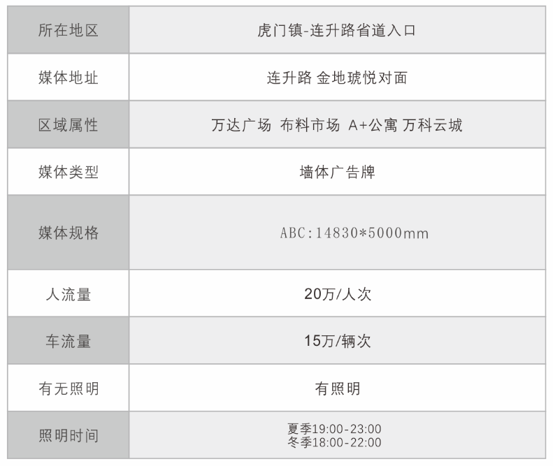 资源简介 本广告位为墙体广告牌,位于连升路金地琥悦转盘,汽车总站旁,该路段为虎门商业中心区及城市主干道交汇处,是省道转入万达商圈、布料商圈的入口;广告位周边有万达广场、布料市场、+公寓万科云城,人车日流量均达到15万以上,设有多盏高功率射灯,晚上依旧清晰可见,极具商业价值。 |