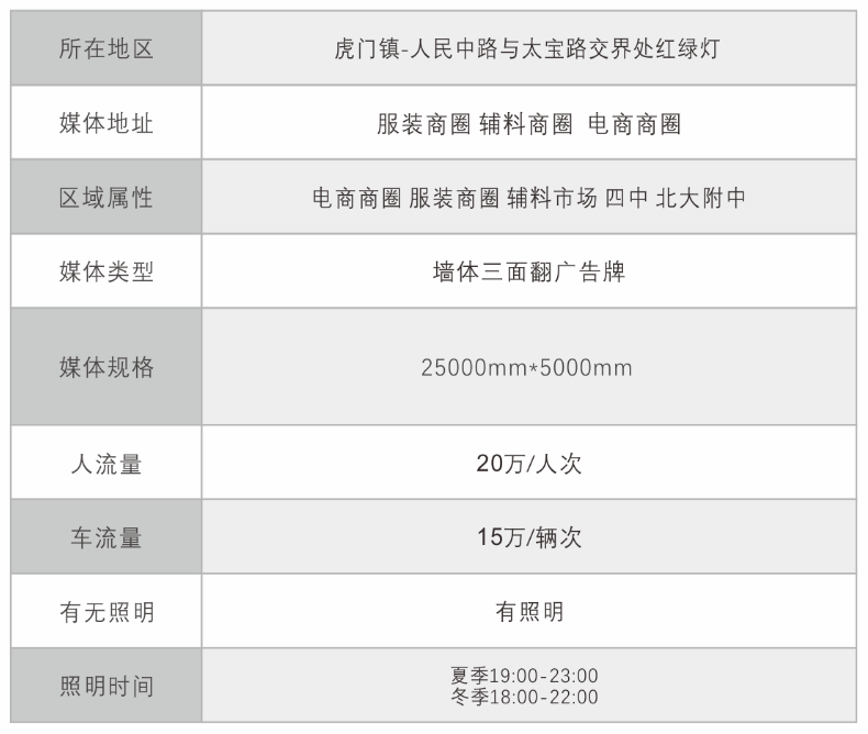 资源简介 本广告位为墙体三面翻广告牌,位于虎门镇-人民中路与太宝路交界处红绿灯,该路段为虎门繁华商圈主干道,是来往虎门布料市场、虎门时装城的主要道路;广告位周边有电商商圈、服装商圈辅料市场、虎门第四中学等,人车日流量均达到15万以上,设有多盏高功率射灯,晚上依旧清晰可见,极具商业价值。 |