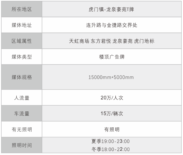 资源简介 本广告位为楼顶广告牌,位于虎门镇连升路天虹路段,此处周围大型商业广场众多,广告位周边有天虹商场、东方君悦、虎门不夜天美食街、龙泉豪苑、虎门地标,人车日流量均达到20万以上,设有多盏高功率射灯,晚上依旧清晰可见,极具商业价值。 |