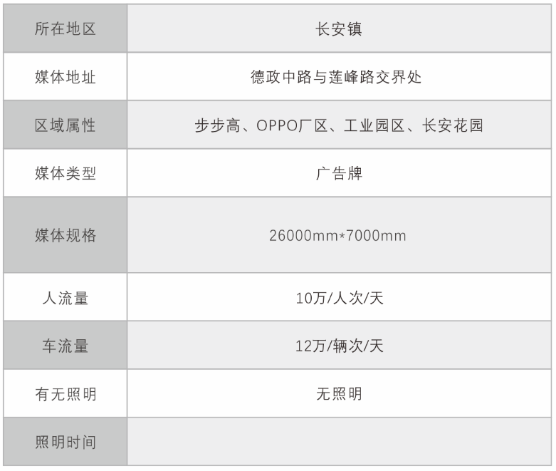 资源简介 本广告位为墙体三面翻广告牌,位于长安德政中路与莲峰路交界处,该路段为长安商业中心区及城市主干道交汇处,是进入长安镇中心厂区工业园区、长安花园,人的必经之路;广告位周边有步步高、车日流量均达到10万以上,极具商业价值。 |